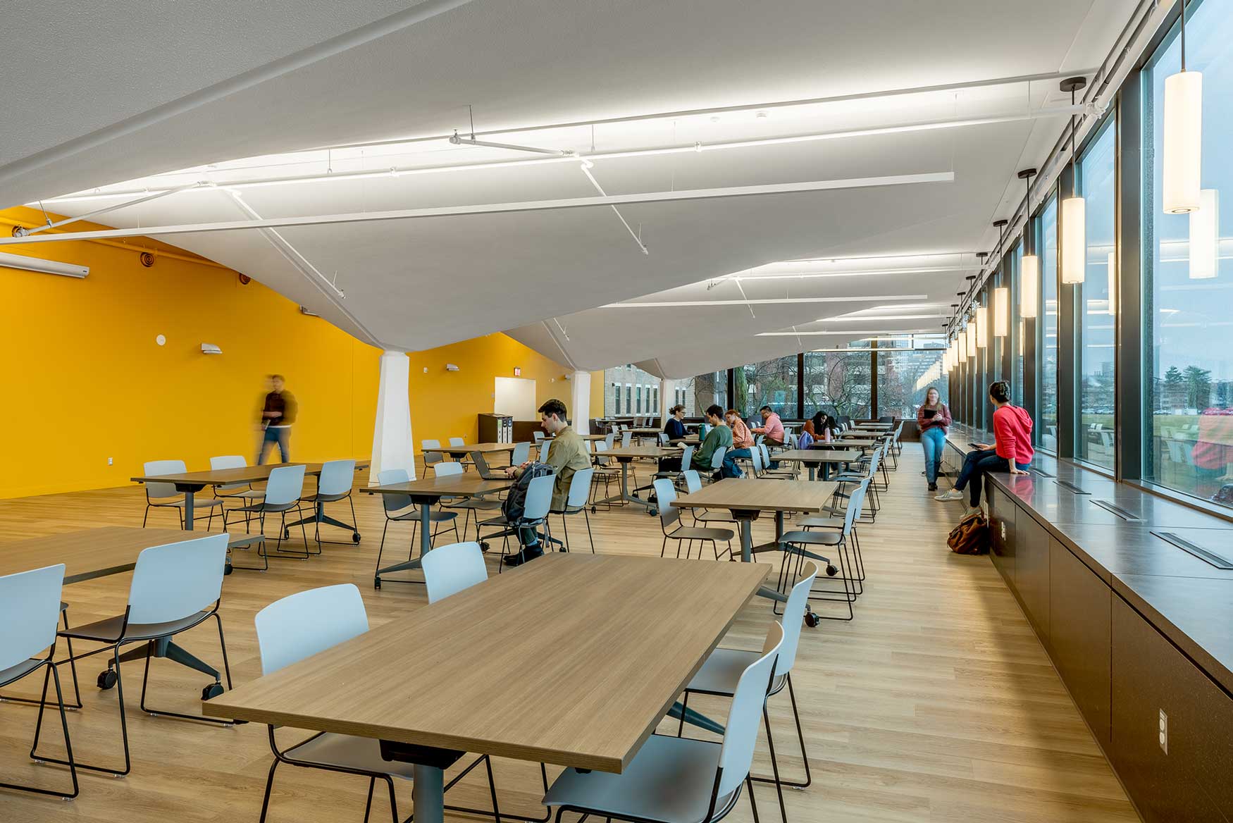 Burton-Conner House has been home to MIT undergraduates since 1948, occupying a 1927 building on the Charles River that holds a particular place in the Institute's residential history. When MIT undertook a comprehensive two-year renewal of the five-story building, the Porter Room presented the most architecturally demanding challenge of the project. Originally designed as a dining hall, the space features a series of dramatically folded ceiling planes that rise and pitch across 6,500 square feet, pulling the eye toward views over the river. The geometry defines the room, so any acoustic intervention would have to honor it.